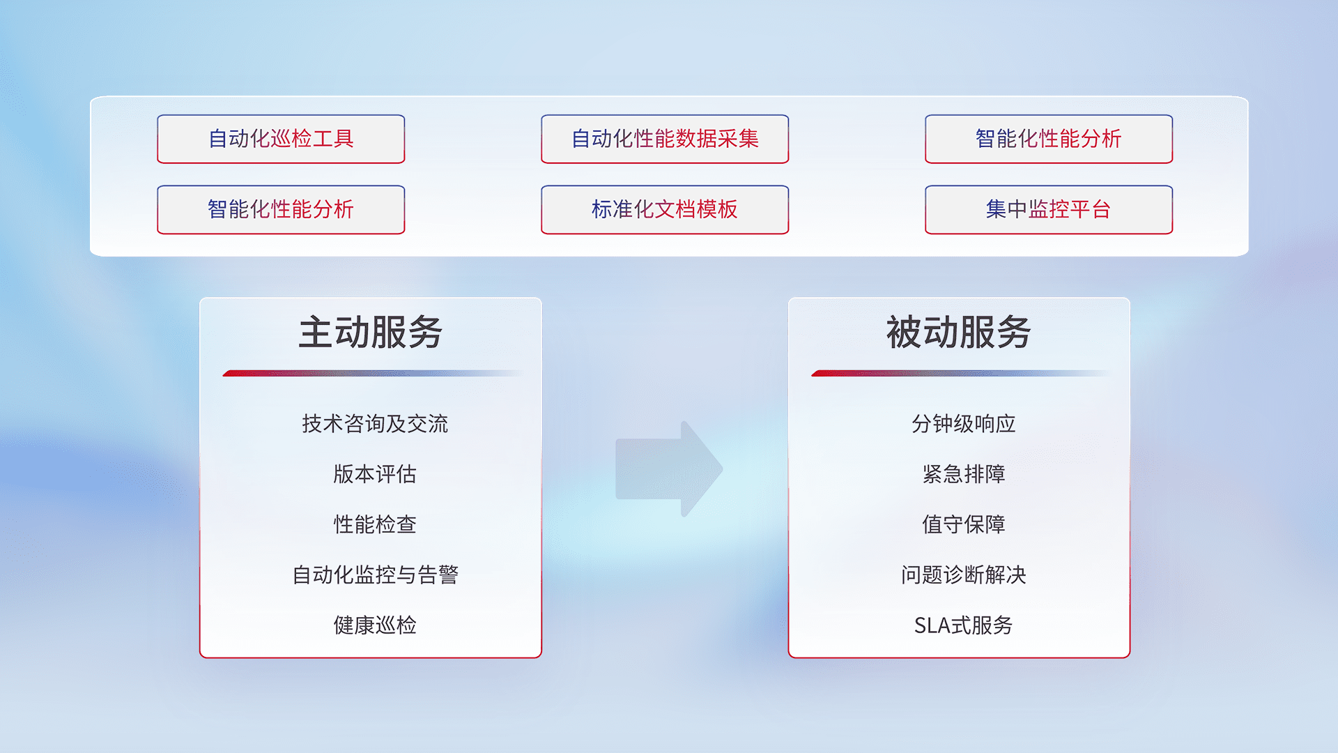 智能化工具和标准化文档,,,,保障服务质量,,,,提供主动服务(包含技术咨询、、版本评估、、性能检查、、、、自动化监控与告警、、、健康巡检)和被动服务包含(分钟级响应、、、紧急排障、、、值守保障、、、、问题诊断解决、、、、SLA服务)。。